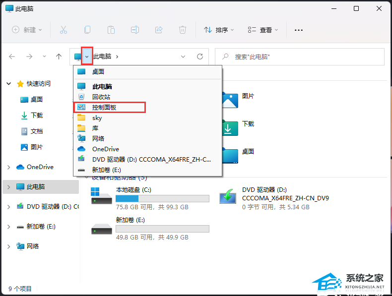 打开【文件资源管理器】,然后点击此电脑左侧的【向下小箭头】,在展开的列表中,就可以选择【控制面板】。