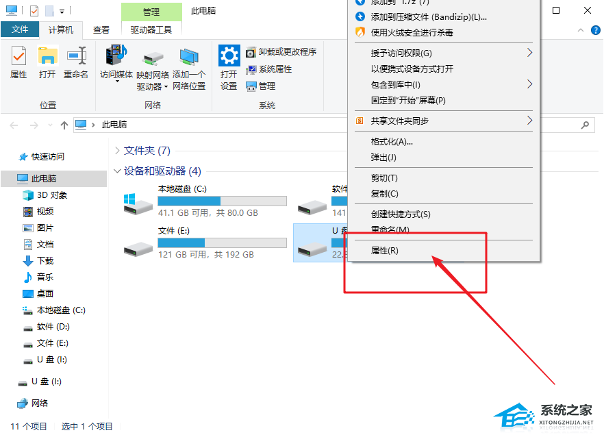 1. 此电脑文件资源管理器窗口中,找到并右键点击移动硬盘,在打开的菜单项中,选择属性。