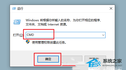 2. 按Win+R组合键,打开运行,并输入:cmd,确定或回车,可以快速打开命令提示符窗口(建议使用管理权限创建此任务)。