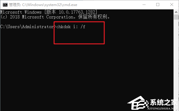 3. 管理员命令提示符窗口中,输入并回车执行:chkdsk i: /f 命令,以进行修复操作,其中 i: 表示移动硬盘盘符。