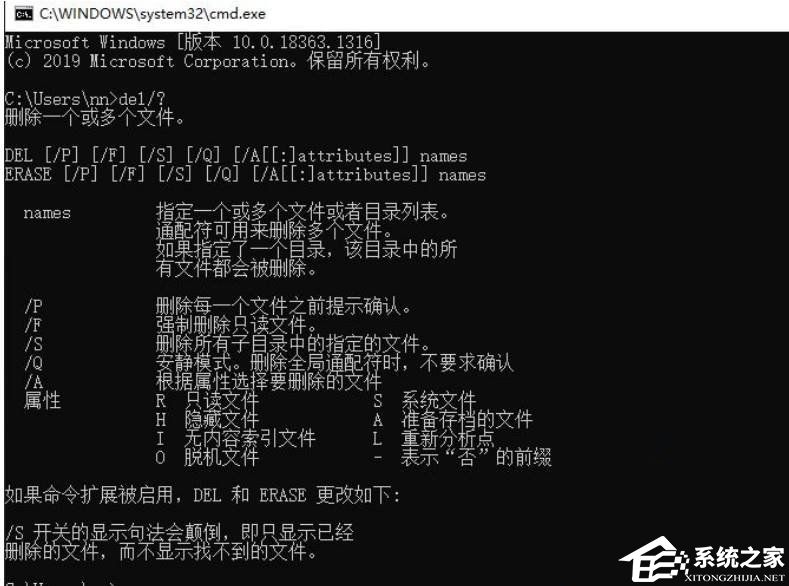 2. 命令提示符窗口,输入 del /? 命令,可以查看该命令的使用方法;