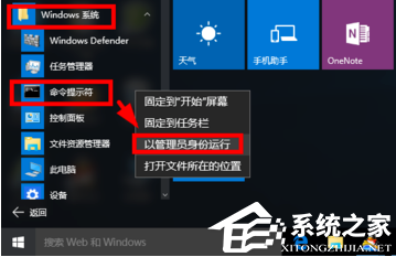 1. 在开始菜单中点开Windows系统文件夹里的命令提示符,右键点击它,选择以管理员身份运行。或者在搜索框输入cmd,快速找到命令提示符,点击以管理员身份运行;