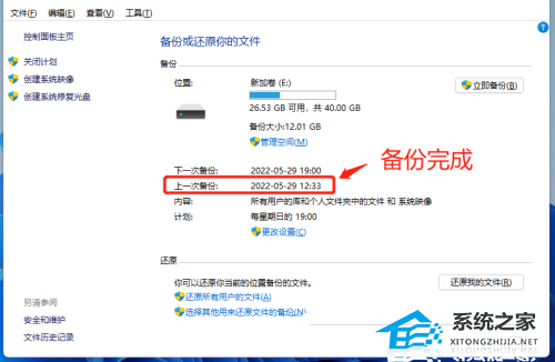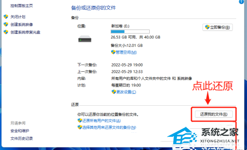 8. 有了系统备份之后,如果需要恢复,可以点击此页的【还原我的文件】,然后按照还原向导进行操作即可。