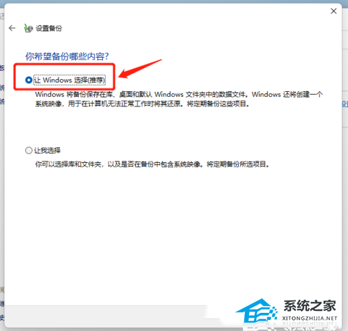 4. 选择备份内容,默认选择【让 Windows 选择(推荐)】,默认的内容包含C盘桌面、文档、下载等常用文件夹,以及系统镜像,再点击【下一页】;