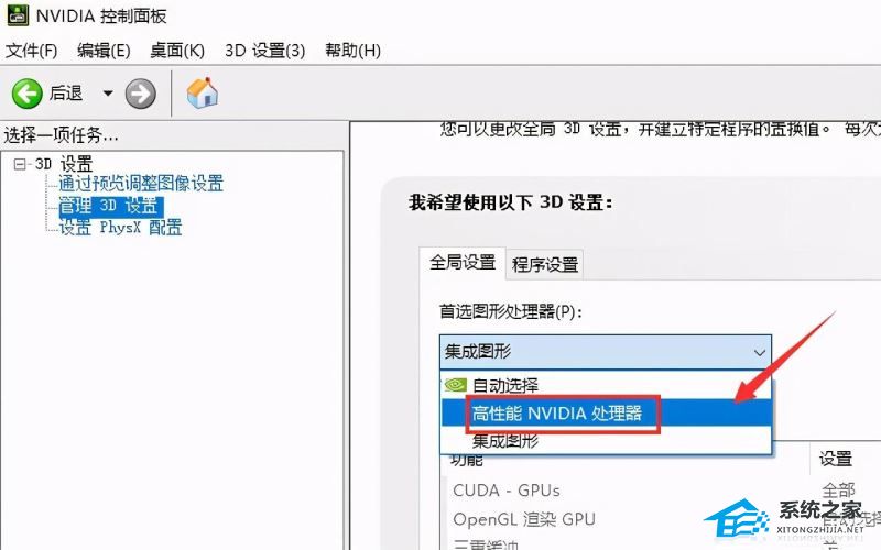4. 在“全局设置”下,选择“高性能NVIDIA”处理器就能切换使用独立显卡了。