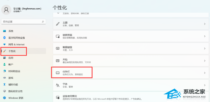点击左侧的“个性化”后再点击右侧的“任务栏”。
