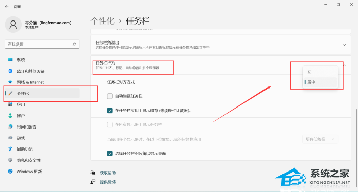 选择“任务栏对齐方式”点击右侧“左”即可。