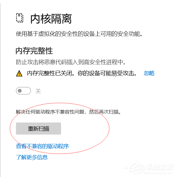 如果没有自动恢复正常你可以回到“内核隔离界面”手动开启内存完整性。
