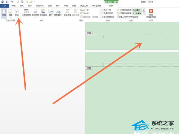 1、开启word文档,在文档底部双击并呼出页脚,从设计界面中选择页码。