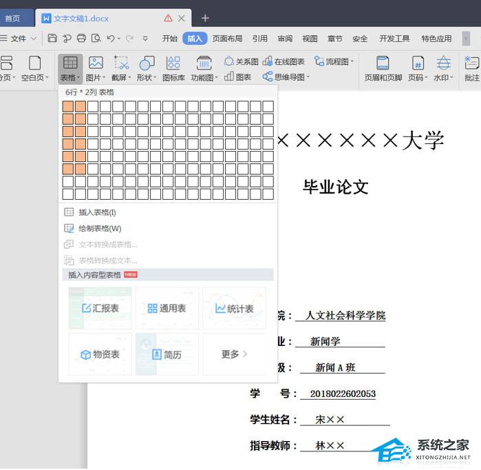 在这里需要用到表格功能,在菜单栏中选择【插入】-【表格】,根据封面内容选择行列数(6列*2行)。