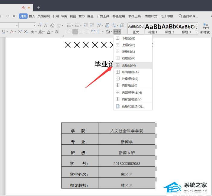 接着全选表格,在开始的菜单栏边框选项中选择【无框线】。