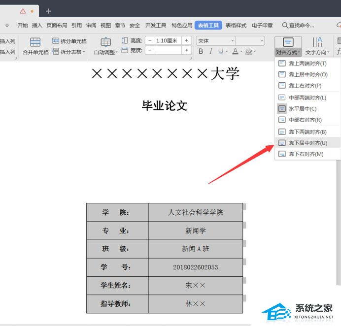 调整列宽至合适宽度并选取表格全部内容,在表格工具中选择【对齐方式】-【靠下居中对齐】,文本内容会稍微向下贴近边框线。