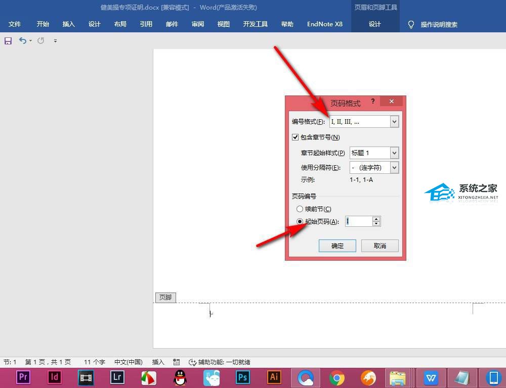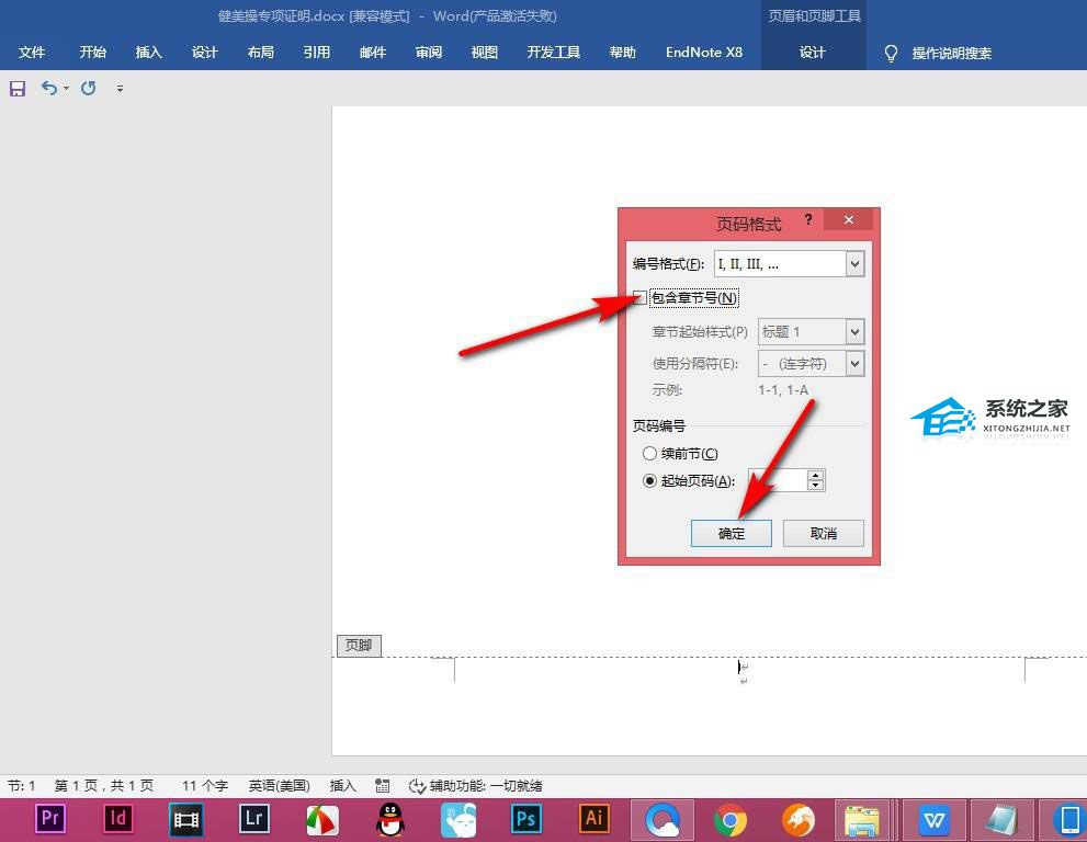 6、插入页码之后,再次打开页码格式,注意将包含章节号去掉勾选,点击确定。