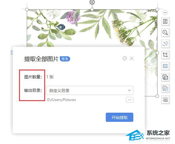 弹出此对话框,会告知您文档中有多少张图片及可设置输出路径,设置好后,单击【开始提取】,提取成功文档中的图片会自动生成文件夹进行保存。