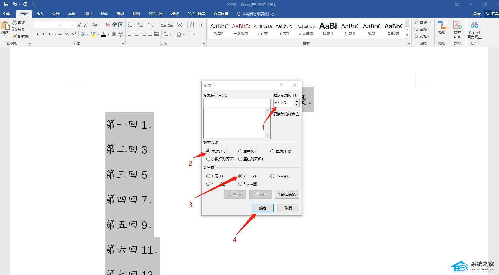 默认制表位选择30,(这个数字可以根据你自己纸张大小调整,我这里是A4纸)如果想让数字再往后点,把数字设大点就OK,然后选左对齐,前导符选2,点击确定。