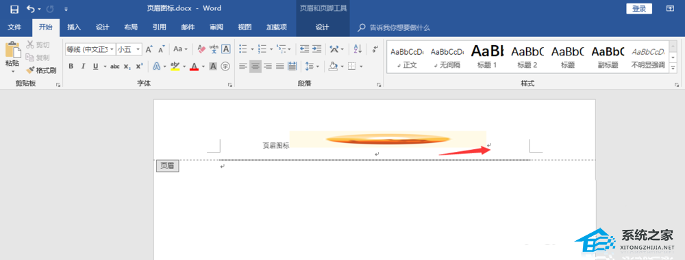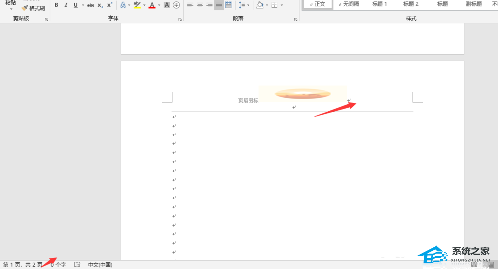 6、插入页面图标与文字完成后,切换到文档的第二页可以看到页眉是自动传递的。