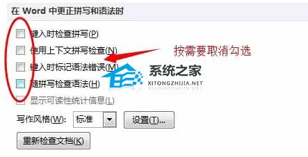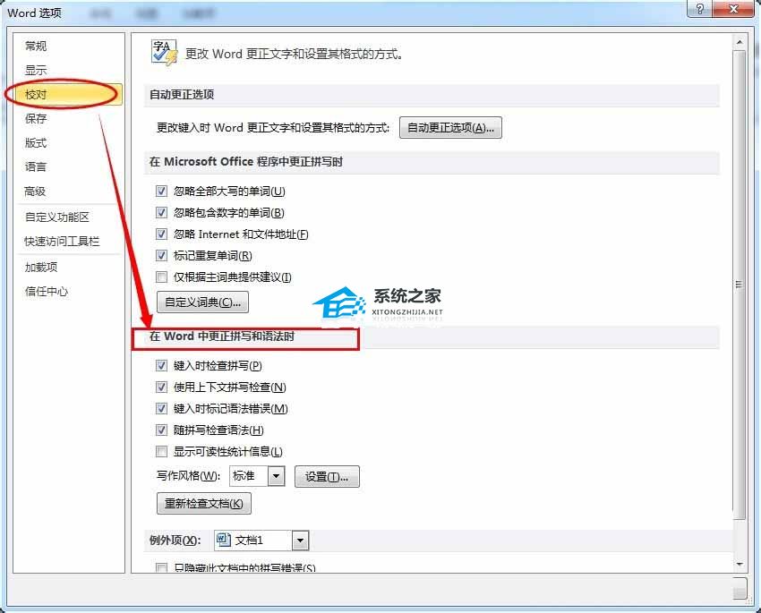 5、在弹出的【word选项】窗口中,选择【校对】选项卡,在右侧【在word中更正拼写和语法时】取消勾选【键入时检查拼写】、【键入时标记语法错误】复选框,这样【拼写和语法检查】的功能也会同时关闭了。