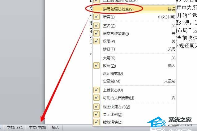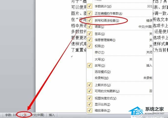 3、或者在状态栏任意位置单击鼠标右键,在弹出的菜单中取消勾选【拼写和语法检查】命令,此时状态栏的“拼写和语法检查”按钮消失。