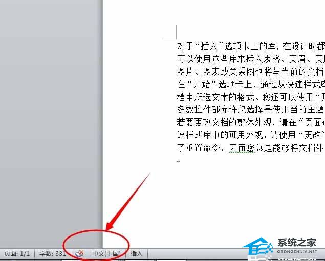 1、首先,打开word2010办公软件,进入正常的工作文档区。看到word底部位置的状态栏上有【中文 中国】字样,鼠标双击这里。