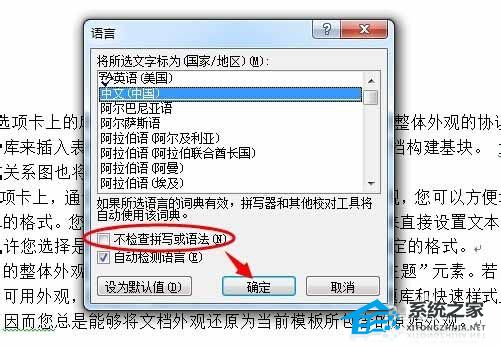 2、在弹出的【语言】对话框中,单击勾选【不检查拼写或语法】复选框。