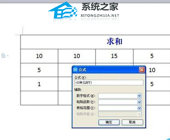3、弹出公式的对话框,选择公式为=sum(left),一般会根据光标位置默认生成,left意思就是求前面单元格的数据之和。点击确定。