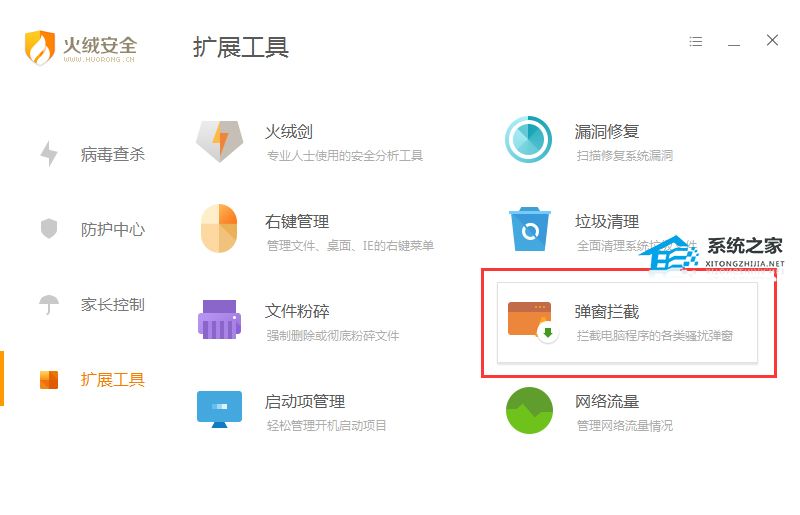 2、在扩展工具中选取“弹窗拦截”功能(注:首次使用需下载),把弹窗拦截取消掉就可以了。