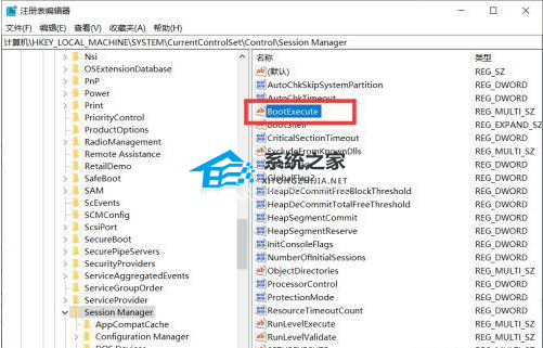 4、在右边的窗口中找到:BootExecute,双击鼠标右键。