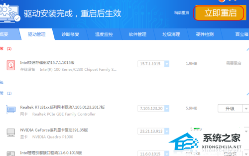 3、下方会显示需要升级的驱动,点击相应品牌显卡后的“升级”下载。下载成功之后点击“安装”,最后重启设备即可。