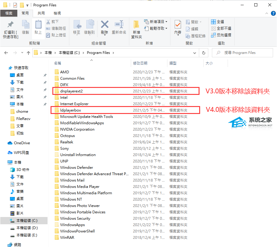第三步:若新增的模拟器同样出现错误信息提示,打开C:\Program Files\资料夹,出现错误提示的是V3.0版本,则找到dnplayerext2资料夹,将整个资料夹清除后重新下载模拟器,如果出现错误信息的是V4.0版本,则找到ldplayerbox资料夹,清除后重新下载模拟器即可解决。