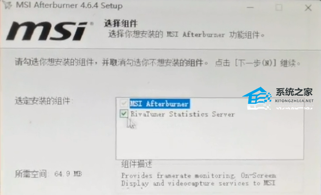 2、重新安装微星小飞机,安装过程中要勾选rivatuner statistics server这个选项,这是显示帧数和其他参数的一个软件。