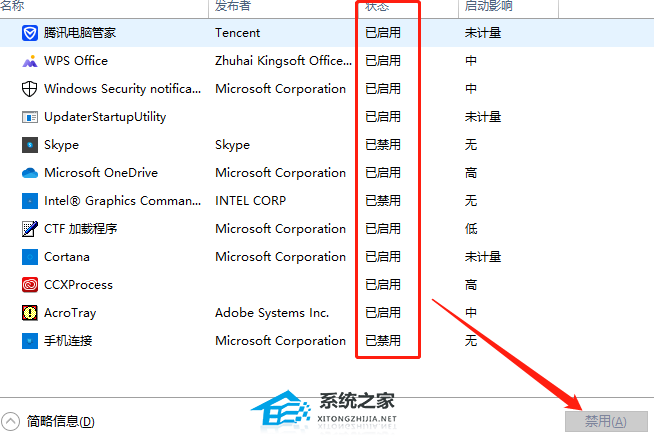 4、这里可以看到设置启动的软件,选择后点击下方的禁用就可以禁止了。