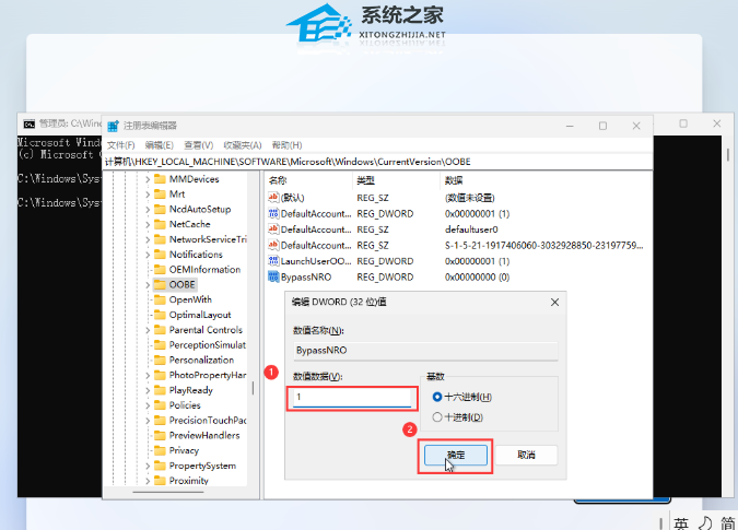 3、给这个新建的值命名为【BypassNRO】,双击打开BypassNRO这个值,然后在编辑 DWORD (32 位)值窗口,将数值数据修改为【1】,再点击【确定】。