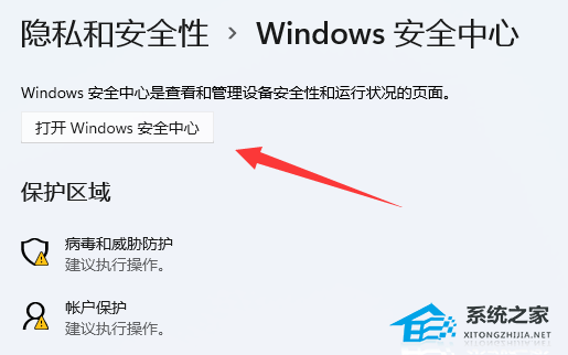 5. 进入后选择“打开windows安全中心”就是win11自带的杀毒软件了。