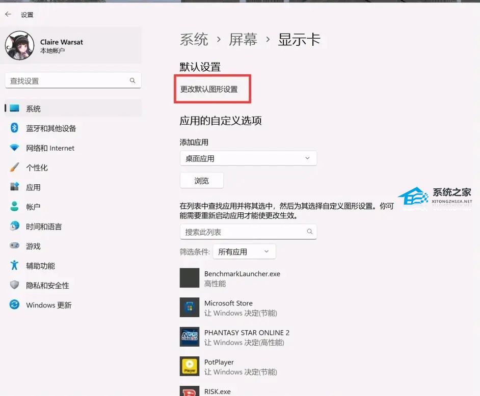 打开设置,选择系统-屏幕-显示卡,继续点击“更改默认图形设置”;