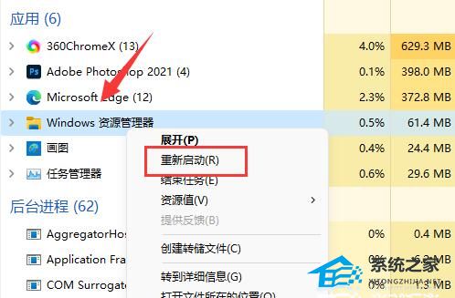 2. 打开后,右键“Windows资源管理器”,点击“重新启动”即可。
