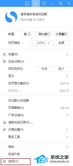 2、点击之后会在下方弹出搜狗浏览器的菜单窗口,在窗口最下方点击“选项”打开浏览器设置页面。