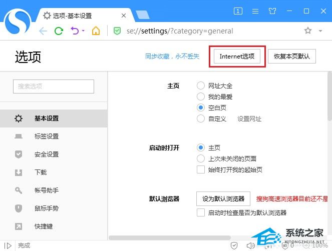 3、此时会进入搜狗浏览器的设置页面中,在页面顶部可以看到“internet 选项”按钮,使用鼠标点击该按钮。