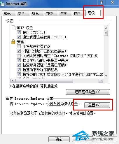 4、此时会弹出internet 属性窗口,在窗口头部点击切换到“高级”选项卡中,可以看到下面有个“重置Internet explorer设置”的选项,我们点击“重置”按钮。