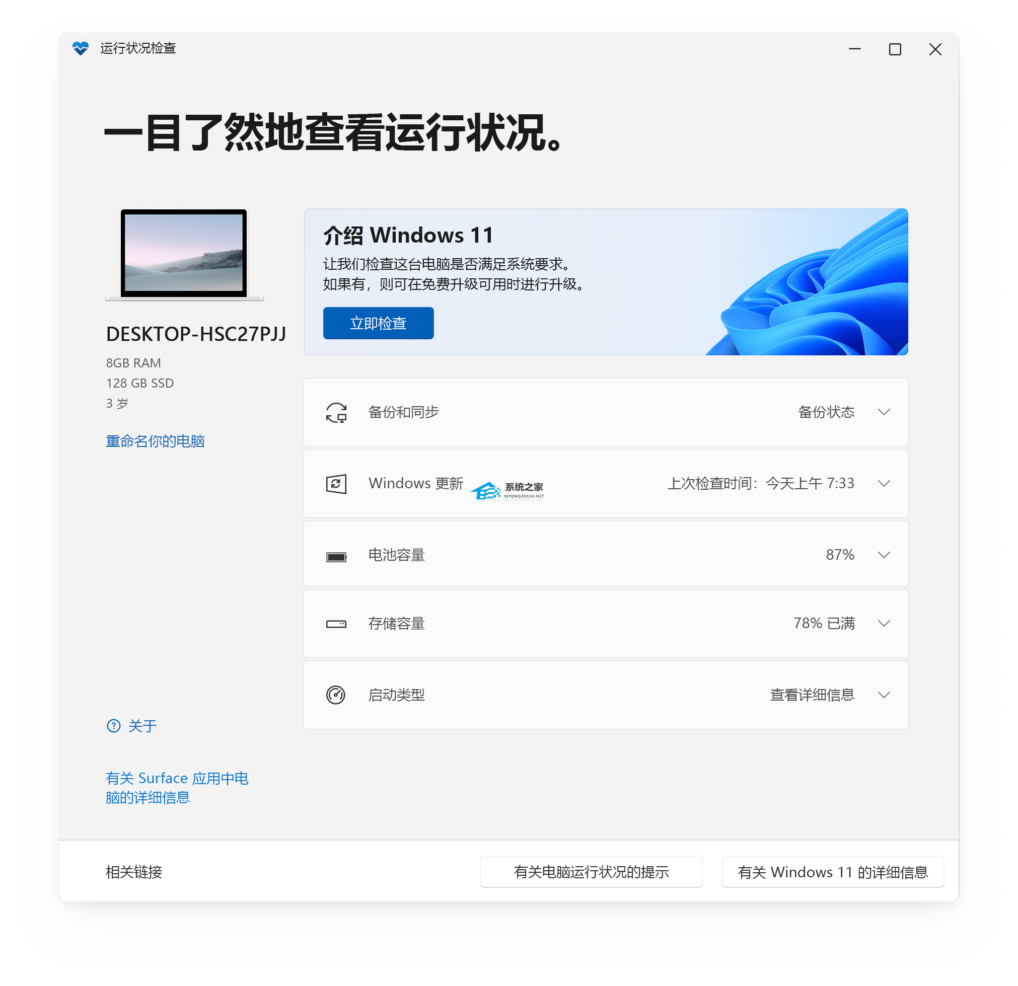 如果电脑健康状况检查更新可用,则可以快速安装最新版本。