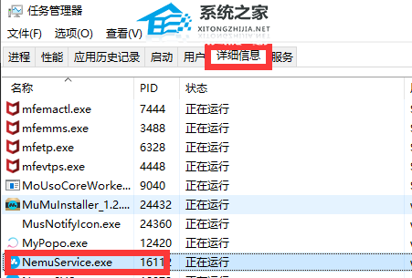 遇到该情况时,请到任务管理器的进程、详细信息标签页面里面找到nemuservice.exe进程,强制关闭之后重启模拟器。