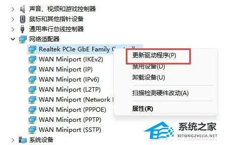 3、接着展开网络适配器,找到无线网卡设备,右键选中,点击“更新驱动程序”。