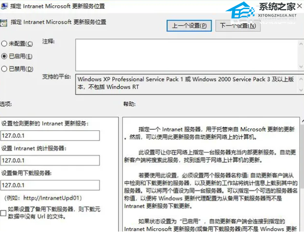 (备注:系统默认是“未配置”状态,即windows可自动更新。若不想要系统自动更新,可以点击“已启用”,然后在“设置检测更新的Intranet更新服务”填写127.0.0.1 (注:127.0.0.1为本机IP),这样一来,系统就不会自动更新,于是就会出现文章开头的“无法连接到更新服务”的提示信息了。)