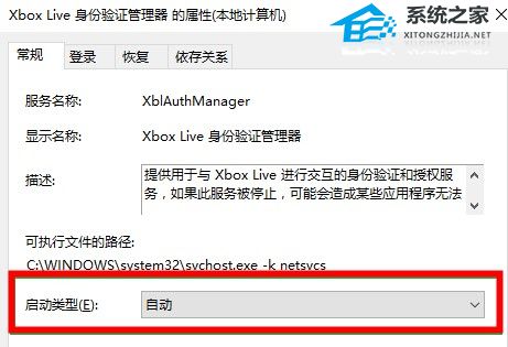 5、在xbox live身份验证管理器服务——右击选择属性——下拉启动类型选择自动——点击确定即可。