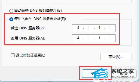 5、然后选择使用下面的dns服务器地址,输入“4,1,1,1”并“确定”保存即可。