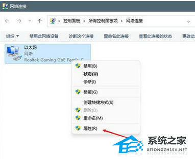 4、右键点击正在使用的网络,然后打开属性。