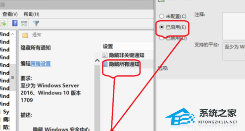 3、在右侧【通知】中,双击【隐藏所有通知】,点击【已启用】>【回车】,即可启用【隐藏所有通知】。