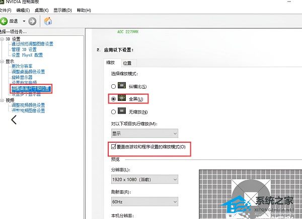 3、然后勾选【全屏】以及下面的【覆盖由游戏和程序设置值的缩放模式】。