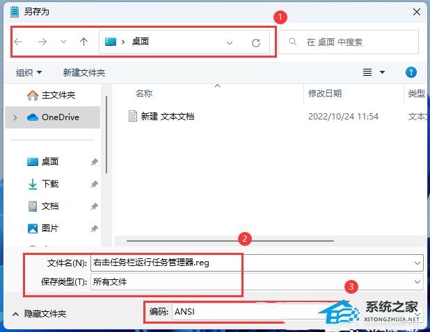 2)文件名填入以【.reg】结尾的名称,保存类型选择【所有文件】