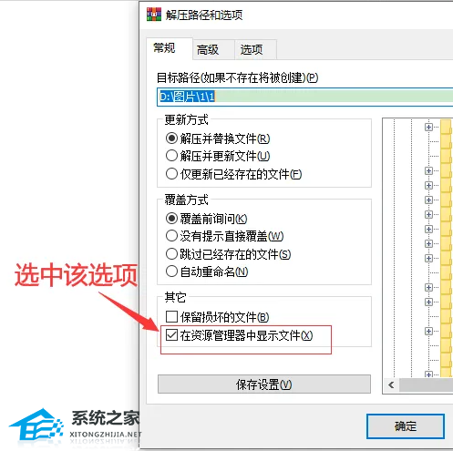 3、然后在解压设置界面常规栏中,勾选“在资源管理器中显示文件”。