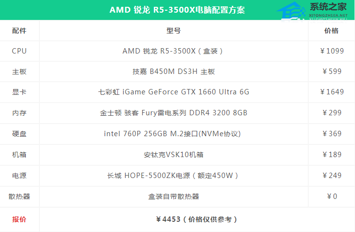 这套R5-3500X配GTX1660主流电脑配置推荐方案预算达到了4500元不到,爽玩1080P各类游戏大作。